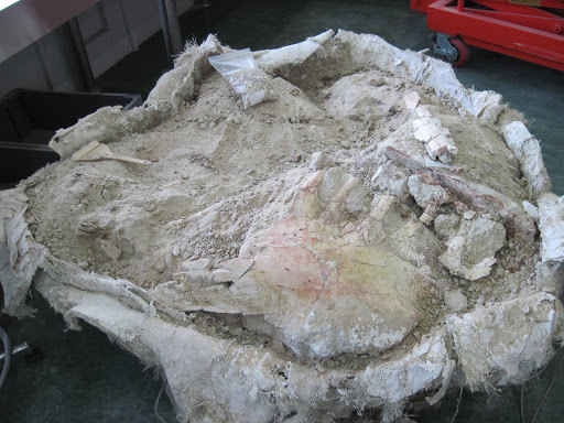 The pelvis is beginning to take shape today. The surrounding rock comes away cleanly from the bone (what we call ‘good separation’), which makes for pretty fast work. Things slow down a bit when I hit weathered, flaky bone – because the bones have not been heavily mineralized, if the hard outer layer of bone (the cortex) comes off, the inner spongy bone can easily turn into powder. When I hit eroded areas, I must slow down and douse the spongy parts in a special glue called Vinac, which is mostly just plastic that dissolves in acetone.