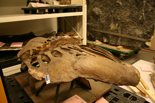 Ankylosaur hips look pretty weird even for dinosaurs, so here’s a picture of a perfect complete specimen at the American Museum of Natural History. This pelvis belongs to a Euoplocephalus from Alberta, and this specimen was very important for my work on ankylosaur tail swinging as it preserves really nice muscle scars that let me map out the tail-swinging muscles. Tail swinging math can be found here! (The blue line on the scale bar is 10 cm long – ankylosaurs were REALLY fat animals!)