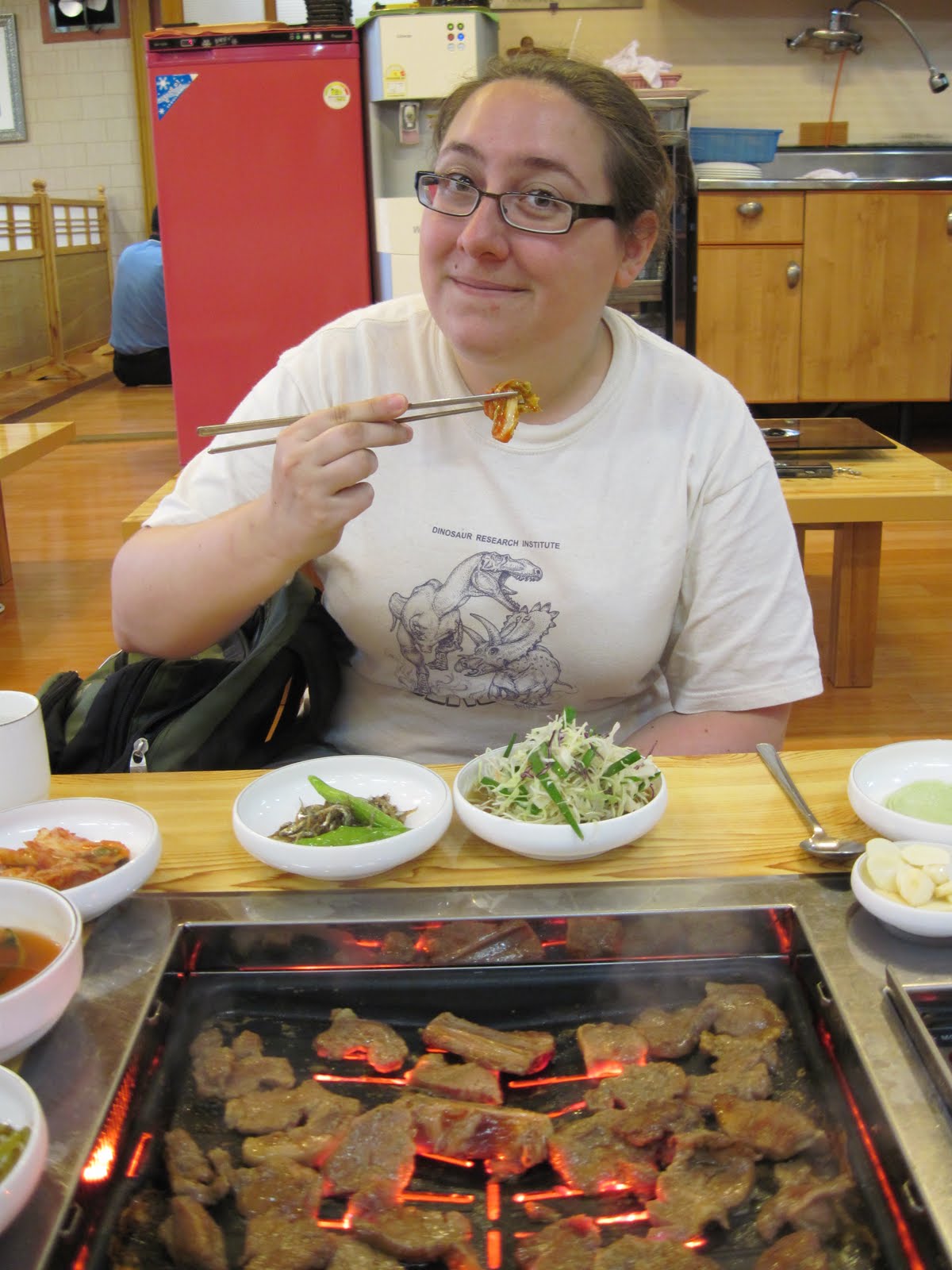Besides the anglerfish adventure, my favourite style of meal is galbi (this is pork, or tawe-jee galbi). The raw meat is brought to your table and grilled in front of you. When it’s a little bit cooked, the server holds it up with tongs and cuts it with scissors into bite size pieces. You then take a lettuce leaf (or any other various leaves, including sesame leaves which are my favourite so far) and load it up with sauce, shredded greens, pork, kimchee, or whatever else from the side dishes you feel like eating. Then you fold up the lettuce and attempt to fit the whole heaping pile in your mouth at once.