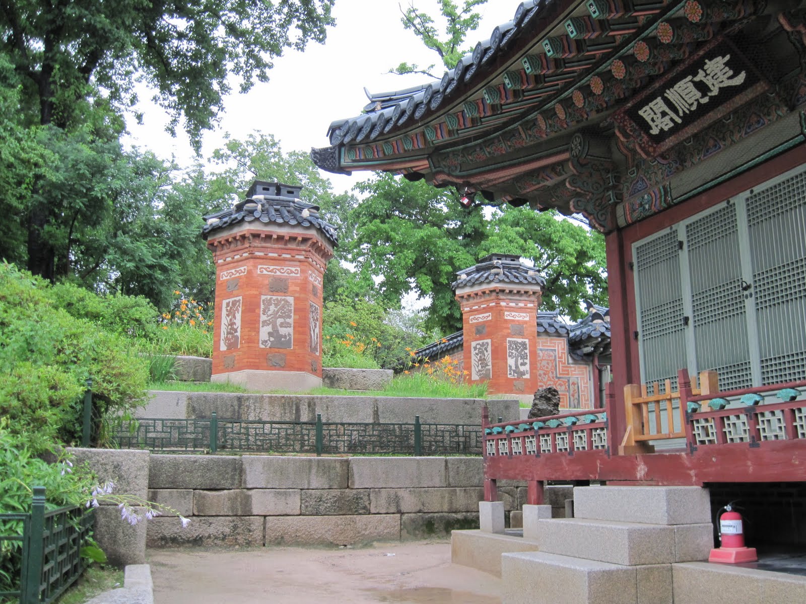 This is the garden behind Gyotae-jeon, the Queen’s residence. The chimneys have various symbolic animals on them. We learned that cranes and turtles represent longevity, butterflies and flowers represent fertility, and, somewhat surprisingly, bats represent wealth.