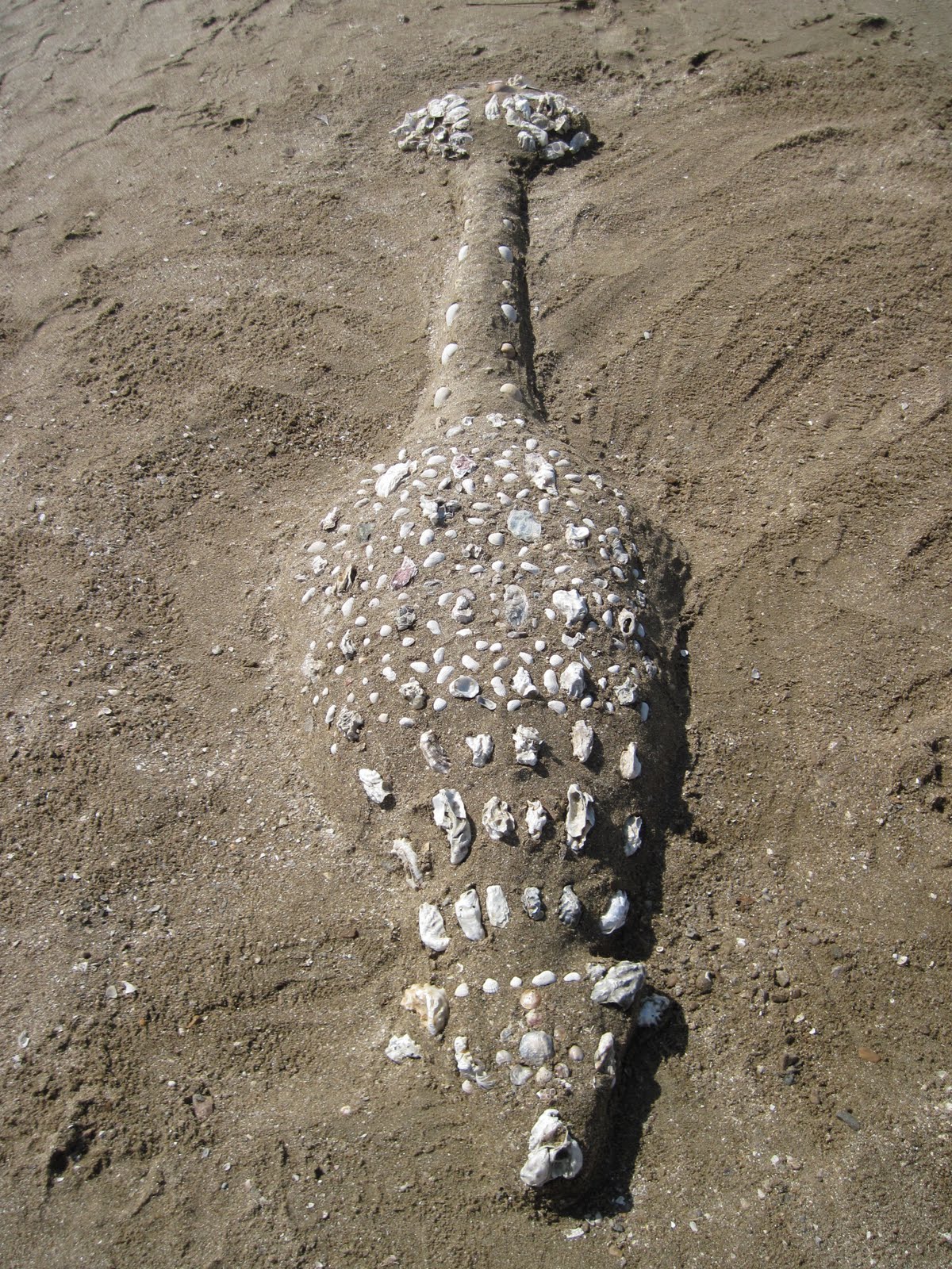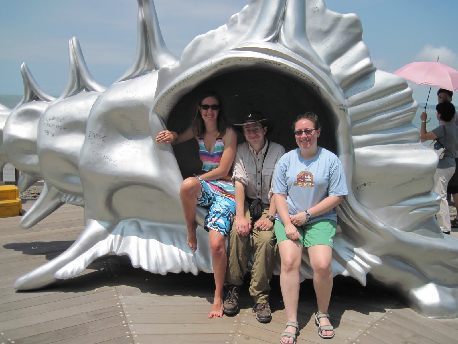 The sand “castles” or should I say dinosaurs were excellent! Hope you did not have a “strange” food adventure in the lovely boat restaurant, since the restaurant looks really interesting. What a great picture of the three of you in the shell!