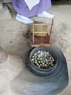 One of the very best things we saw at the Korean Folk Village was the process for getting silk from silkworms! I never had a very good idea of this process, and it was really neat to see how it was done in the old days. The silkworm caterpillars are allowed to create their cocoons, and then the pupae are put into boiling water. A few strands are caught from 5-10 pupae, and then wound up onto a rotating wheel. It was really fascinating but also kind of gross, because the pupae bob around in the water in a very disturbing way.