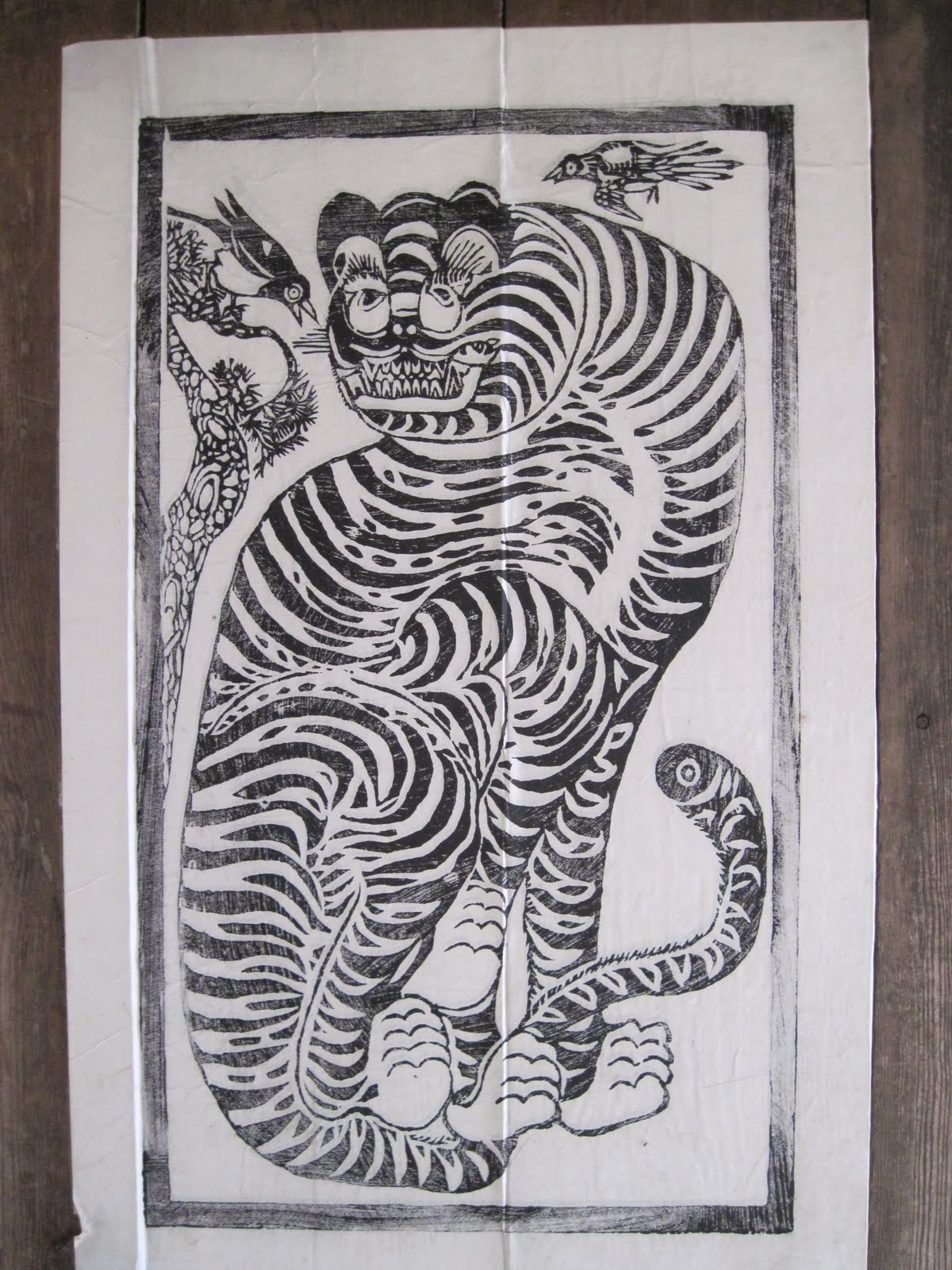 A traditional folk painting in Korea includes a tiger, a magpie, and a pine tree, and is called a jakhodo. The pine tree is a symbol of the first month of the year, the tiger has power to chase away evil spirits, and magpies were good omens that brought good news. I like these very much!