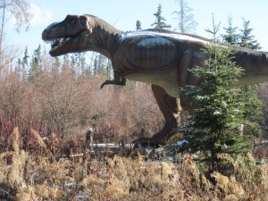 The Jurassic Forest also has a playground and sand pit for digging up fossils, and a multi-purpose educational room. I hear that their first summer of operation went pretty well, and I’m glad – the experience is pretty fun, and although Alberta has a lot of dinosaur attractions, we didn’t really have anything near Edmonton besides a small display at the Royal Alberta Museum. Some of the models are a little off, and there isn’t a whole lot of coherency to what dinosaurs appear in which order. But the placement of the dinosaurs in the forest is really great, there’s lots of signage about the science of palaeontology, and I think that with a tour guide for a school group this would be an excellent educational resource. Hopefully I’ll have a chance to go back in the spring or summer when it’s a bit greener!