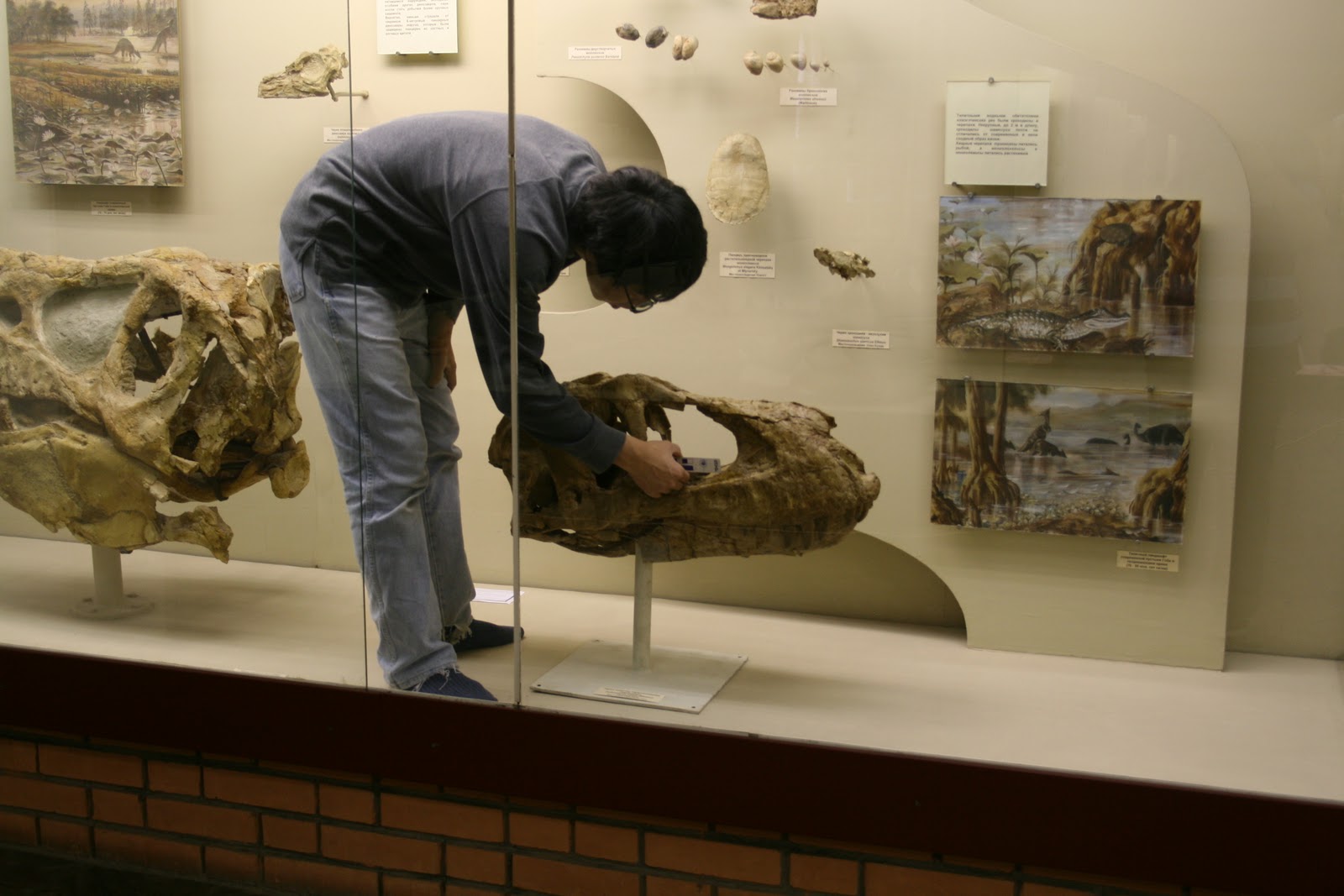 Tetsuto measures a little Tarbosaurus at the Paleontological Institute in Moscow.