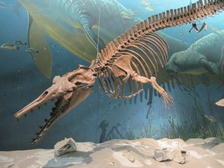 In reference to a very nice mosasaur skeleton, with accompanying illustration: “That’s neat sweetie, look. It looks kind of like a crocodile I guess. It must be a crocodile fish.”