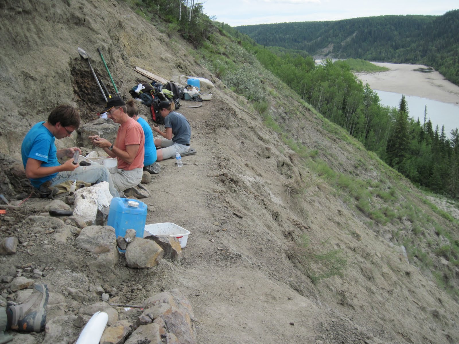 The bonebed is on a steep river side, and we have cut a long but narrow ledge into the cliff. The view is quite spectacular and we occasionally see deer and bears on the other side of the river.