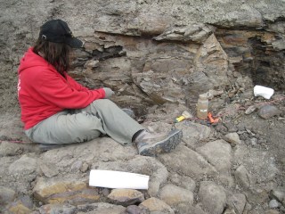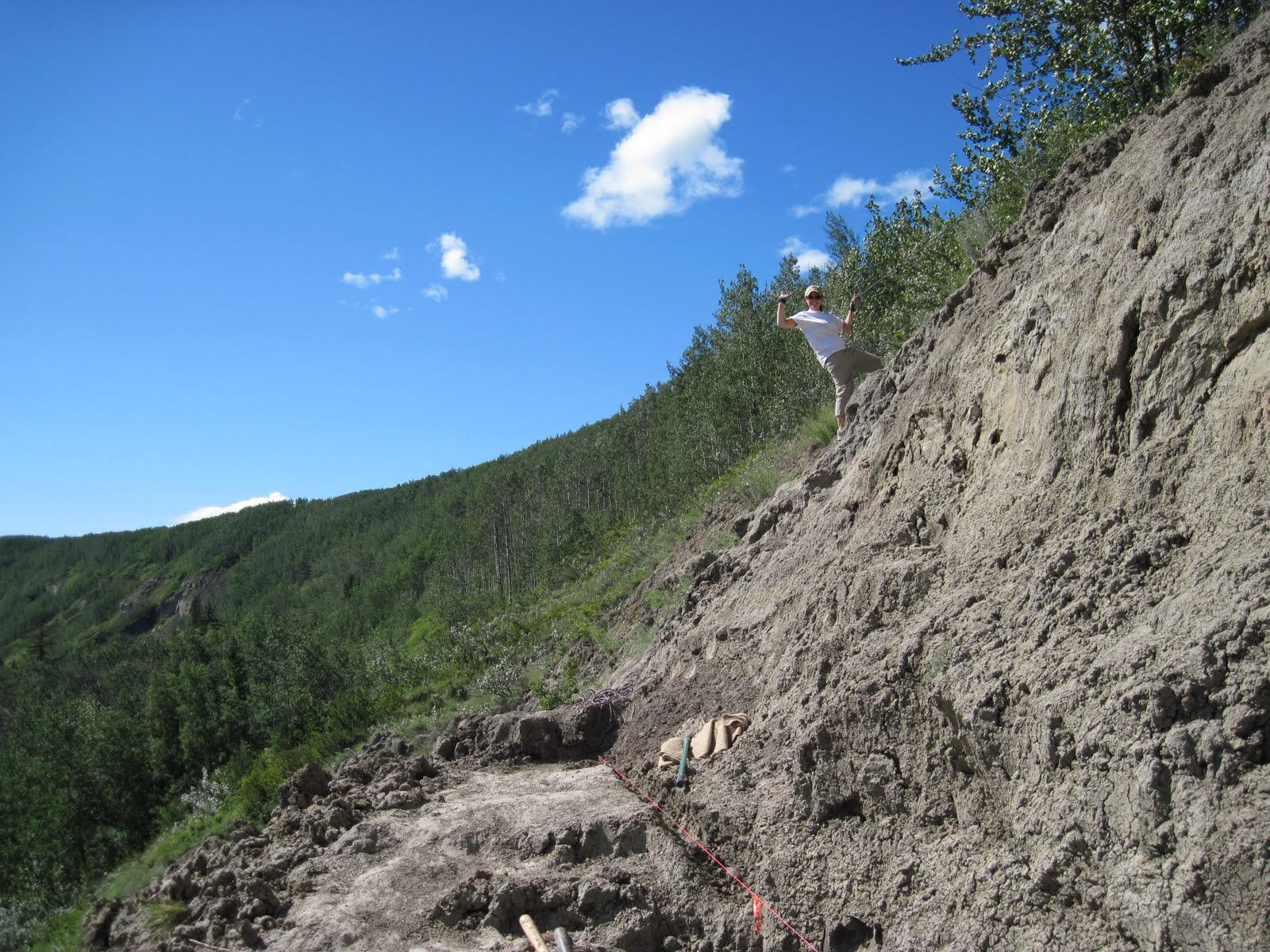 The bonebed is on a steep river side, and we have cut a long but narrow ledge into the cliff. The view is quite spectacular and we occasionally see deer and bears on the other side of the river.