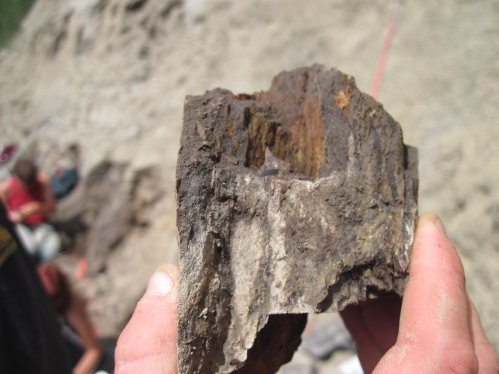 We almost never find teeth at this site, but this year we recovered 2 or 3 ceratopsian teeth and 2 or 3 tyrannosaurid teeth. Here’s one of the ceratopsian teeth, which you can see as a small triangle in the middle of the orange splotch.