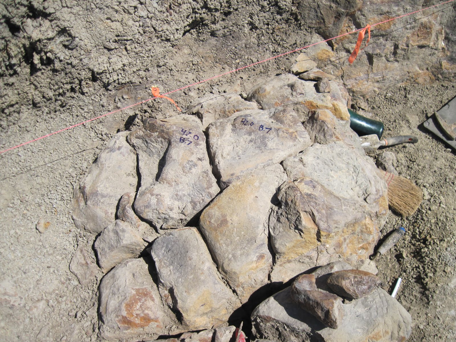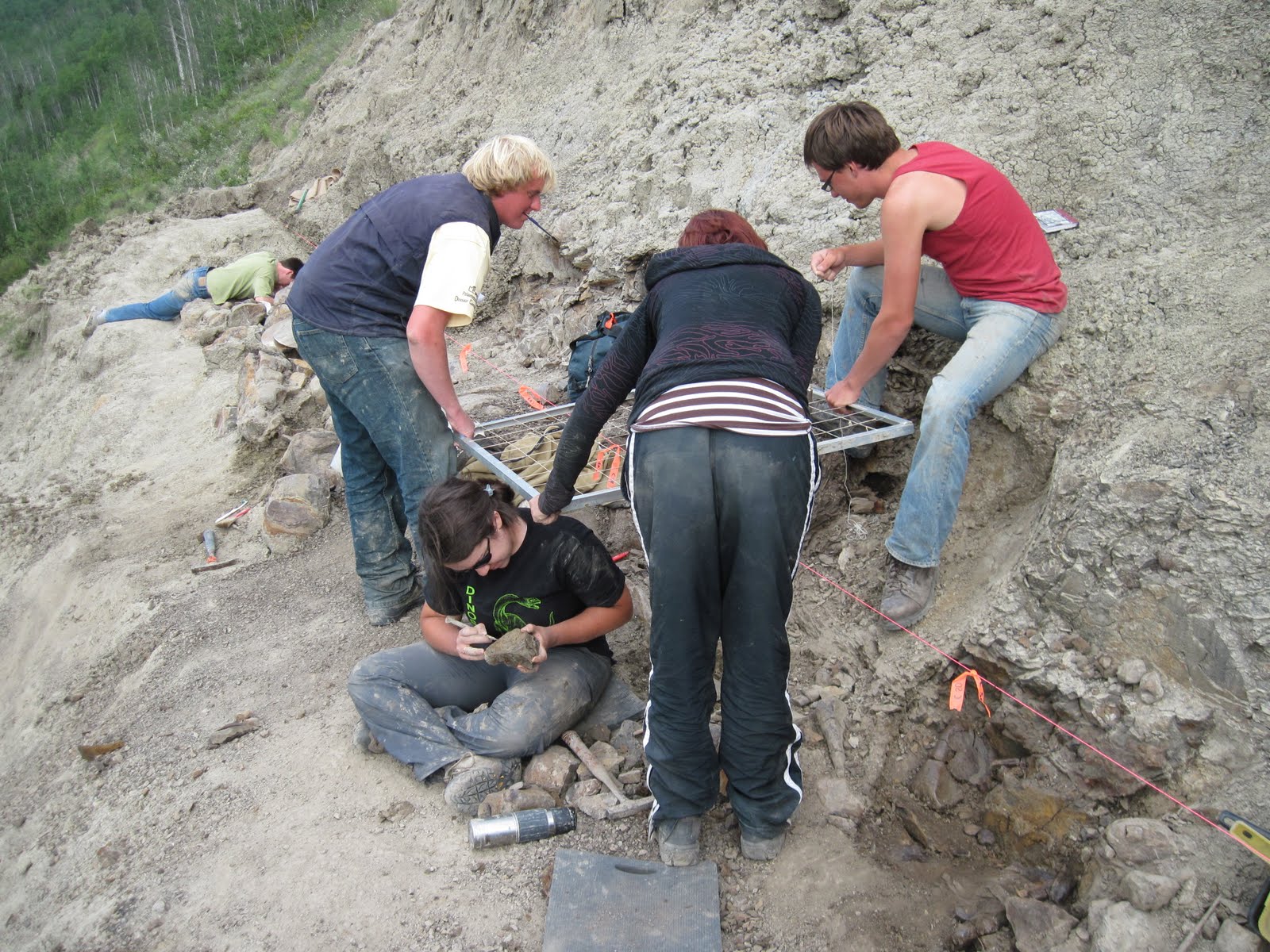I’ve learned that different field crews use different methods for mapping quarries. At the U of A, we use a baseline, grid square, plumb-bob and gridded paper to mark the location and orientation of bones in the quarry. (Sometimes it gets a little crowded, but people’s heads make good supports for the grid square.) The grid square is a square meter, divided into 10×10 cm quadrants. The baseline is marked at 1 m increments along its length, and the grid square is lined up at the relevant marks. If the grid square is very high above the elements you want to map, a plumb-bob is useful for reducing parallax error. Each bone is marked with quarry coordinates, and eventually all of the map sheets are combined in photoshop or illustrator. The maps will help us to understand the taphonomy of the site.