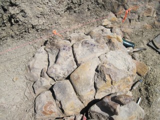 Here’s a Pachyrhinosaurus skull we helicoptered out on the second last day. It may not look like much, but I think this is one of the nicer ones we’ve gotten out of this quarry. You can see a large circle to the left that is probably the orbit. Because the block is already broken into smaller nodules, we jacketed the skull as multiple blocks to make arranging for the helicopter nets a little bit easier. The edges of all of the separate nodules were marked before jacketing so we can piece everything back together in the lab.