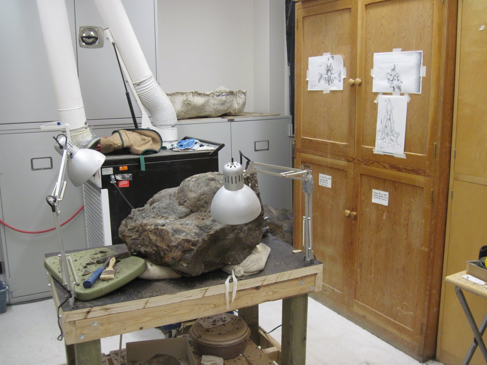 Susan has been pummeling her way through the hard ironstone nodules that enclose the Wapiti River skulls – here is a photo from last fall of progress on the next skull to be prepared. It’s come a long way since then, but it takes a long time to get these guys ready.