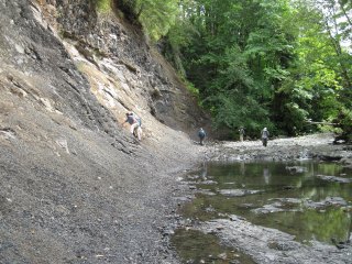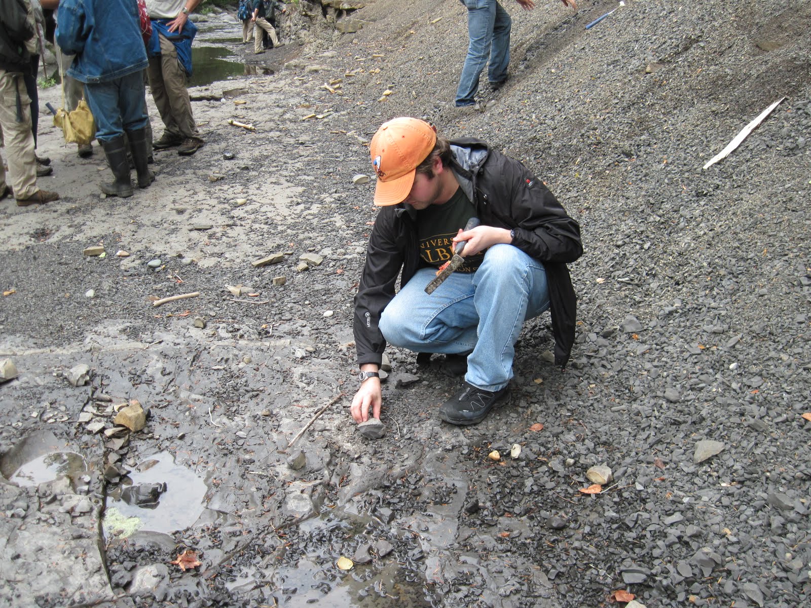 We next headed out to Trent River, a popular place for amateur collectors. Here the Pender Formation crops out, as well as the Comox and Haslam Formations. Abundant nodules contain ammonites, bivalves, and other invertebrates. Elasmosaurs, mosasaurs, and turtles have also been found near this locality! (See more about the Puntledge River elasmosaur at the Courtenay Museum.) These outcrops represent deeper water facies including turbidites.