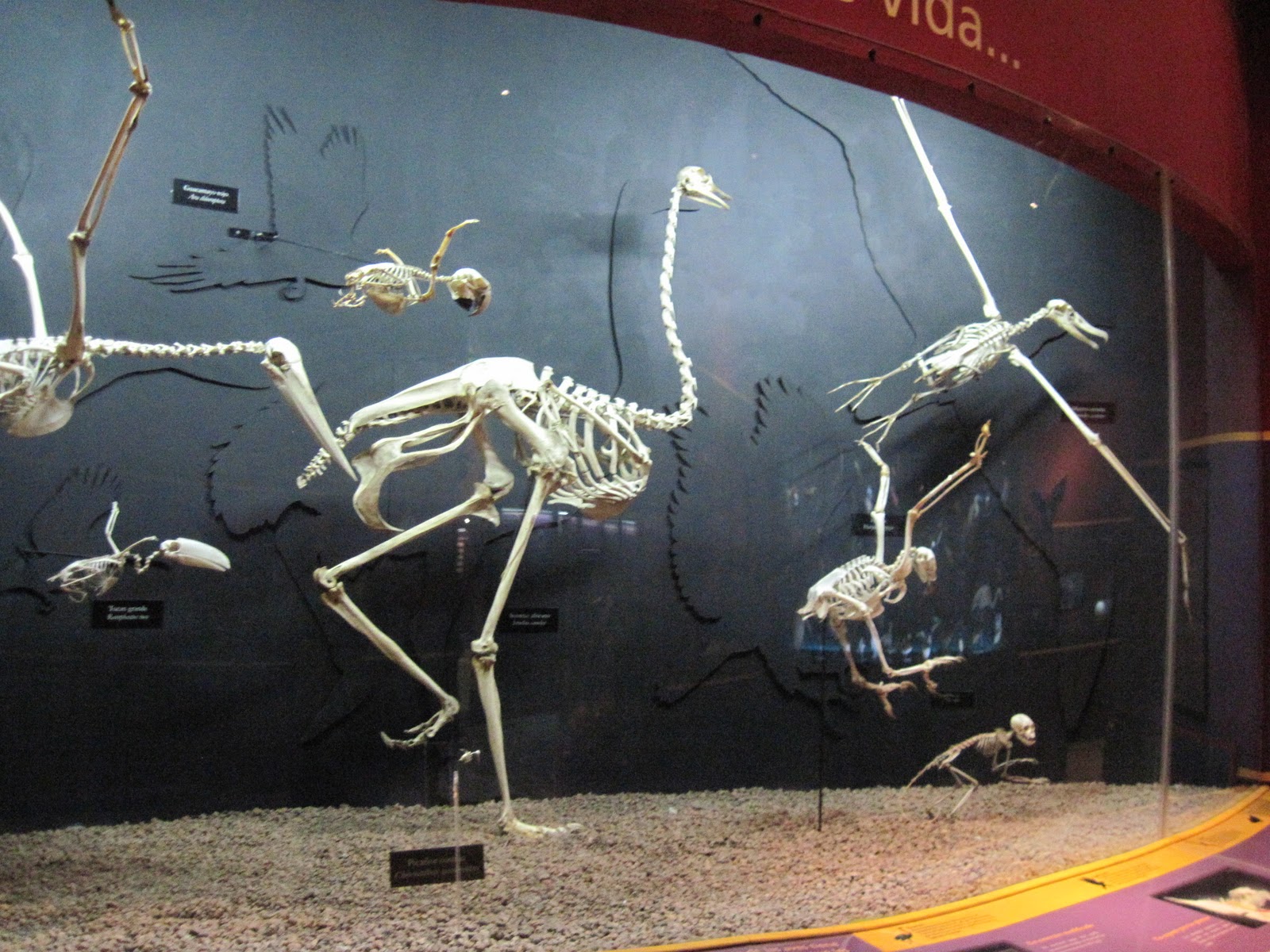 Right after the origin of birds we are treated to this display of extremes in bird skeletons, which really highlights the adaptations for particular lifestyles in different groups: the long, long wings of albatrosses, the oversized feet of raptorial birds, the hilariously gigantic heads of toucans and parrots, and the long legs and short arms of ostriches. They have also cleverly placed a hummingbird in front of the ostrich to highlight the great size range of extant birds.