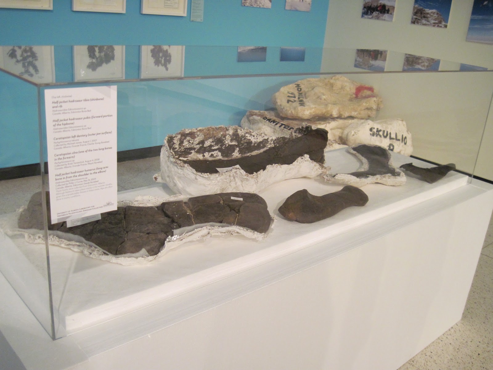 The University of Alberta Laboratory for Vertebrate Paleontology contributed fossils from our Grande Prairie and Edmonton dinosaur bonebed excavations. Although we usually collect stuff in the summer, we’ve had snow during our Edmonton fieldwork, even in May.