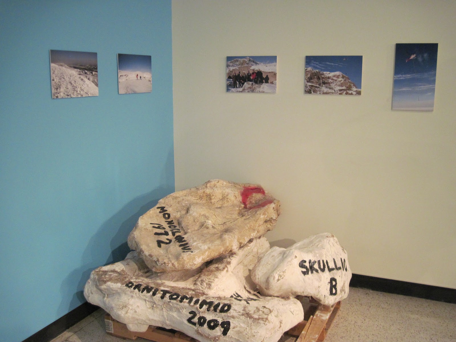 We showed off some field jackets, too. The Monoclonius and ornithomimid are pretty self-explanatory, and if I recall correctly, “Skull B” is from the Wapiti bonebed in Grande Prairie. There were also photos from our December tyrannosaur helicopter lift in Dinosaur Provincial Park, including a photo taken by me!