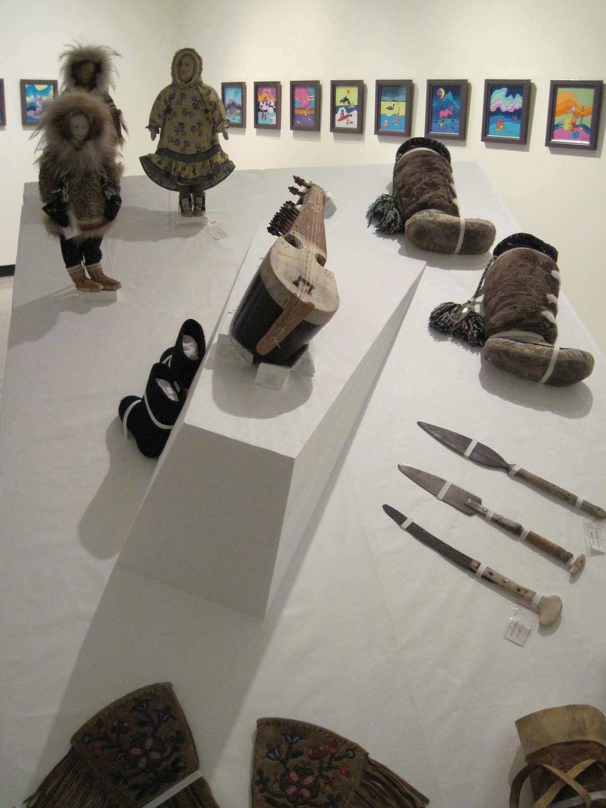 Another display had Inuit dolls, musical instruments, hunting tools, and boots. The beautiful paintings in the background are the original art from Ted Harrison’s “A Northern Alphabet“. Click the photo to make it bigger, and see if you can figure out what letter each painting represents.