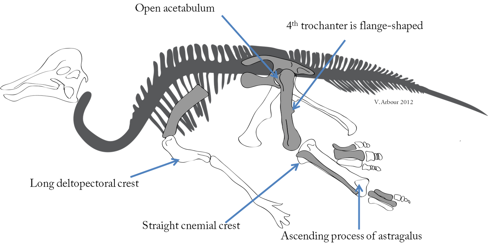 For the advanced-track talk, I thought about talking about dinosaurs as ambassadors of evolution, but didn’t really feel like talking about creationism, so instead I opted for “The Dinosaur Family Tree”, a talk about…systematics! Complete with data matrix! Woohoo! Actually, this seemed to go over fairly well, as I went through the problems that palaeontologists (and most biologists) face when trying to reconstruct the tree of life: understanding sources of variation, defining a species, and running phylogenetic analyses. And we talked about what makes a dinosaur a dinosaur, as well. The diagram above is based off a specimen on display at the U of A Paleo Museum (UALVP 300, a composite of three individuals), with various dinosauromorph, dinosauriform, and dinosaurian features.