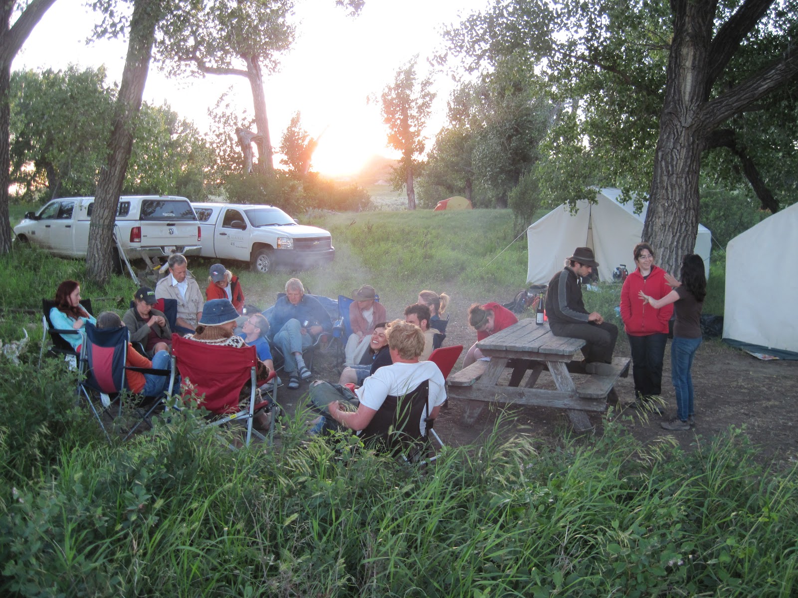 The cabins are full of rattlesnakes, so rather than camping right out in the field, we have a really nice spot in the cottonwood grove near the river. The night I took this photo there were 18 people in camp, but most of the time our crew is around 10 people.