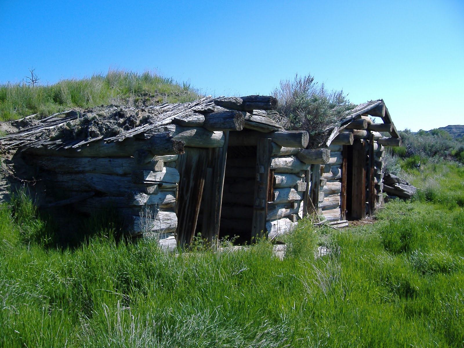 This is Happy Jack’s (or as it used to be called, Old Mexico Ranch), an old homestead occupied by Happy Jack Jackson from 1903 to 1942. There are a couple of log cabins, some with cacti growing on the roof. Happy Jack’s is found on the north side of the Red Deer River in Dinosaur Provincial Park, and is the home base for the Currie Lab when we do fieldwork in DPP.