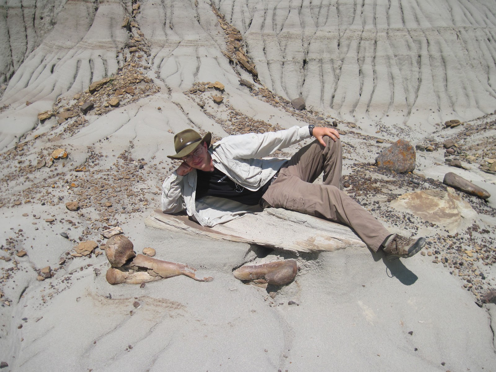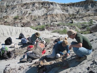 The badlands around Happy Jack’s have been very productive for the last five years, and we’ve collected several very nice skeletons that unfortunately I can’t say anything about yet (but I promise they’re good). This year we didn’t have any major finds, but we did a lot of prospecting and collected lots of interesting small things. In the photo above, a bunch of us are checking out an articulated hadrosaur, that was unfortunately too far gone to be salvageable or worth collecting. It was a nice spot on a sunny day, however, so nobody minded too much. There are always more bones in Dinosaur Provincial Park.