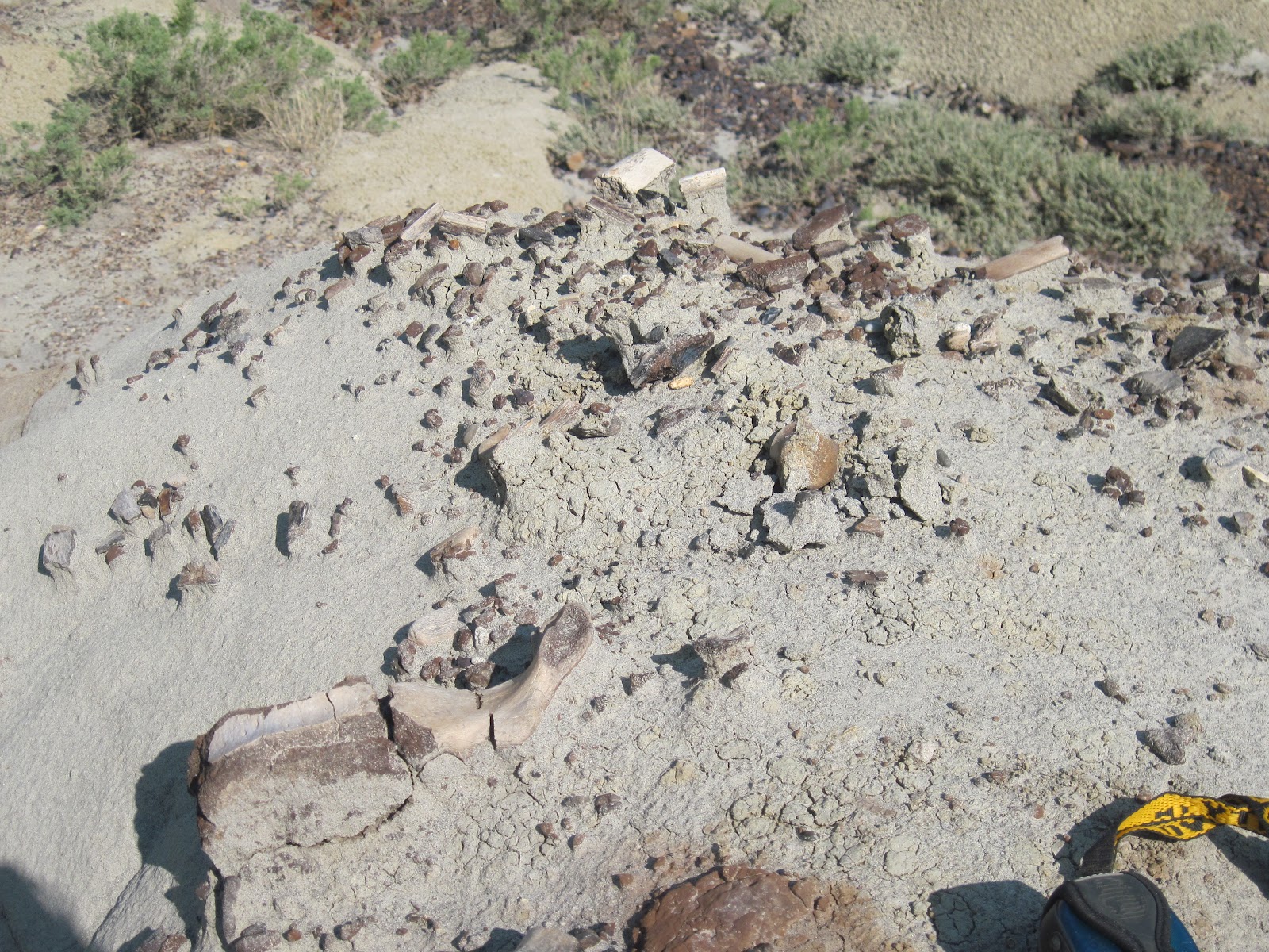 And when I say there are always more bones, I mean it. Dinosaur Park is kind of a ridiculous place. There are so many bones that we only collect things that are complete and well-preserved, so I didn’t bring back the vertebra you can see in the lower left of this picture (although I did get a hadrosaur frontal from this spot). There are many places where you can’t help but walk all over bone fragments, because they are just so numerous.