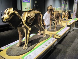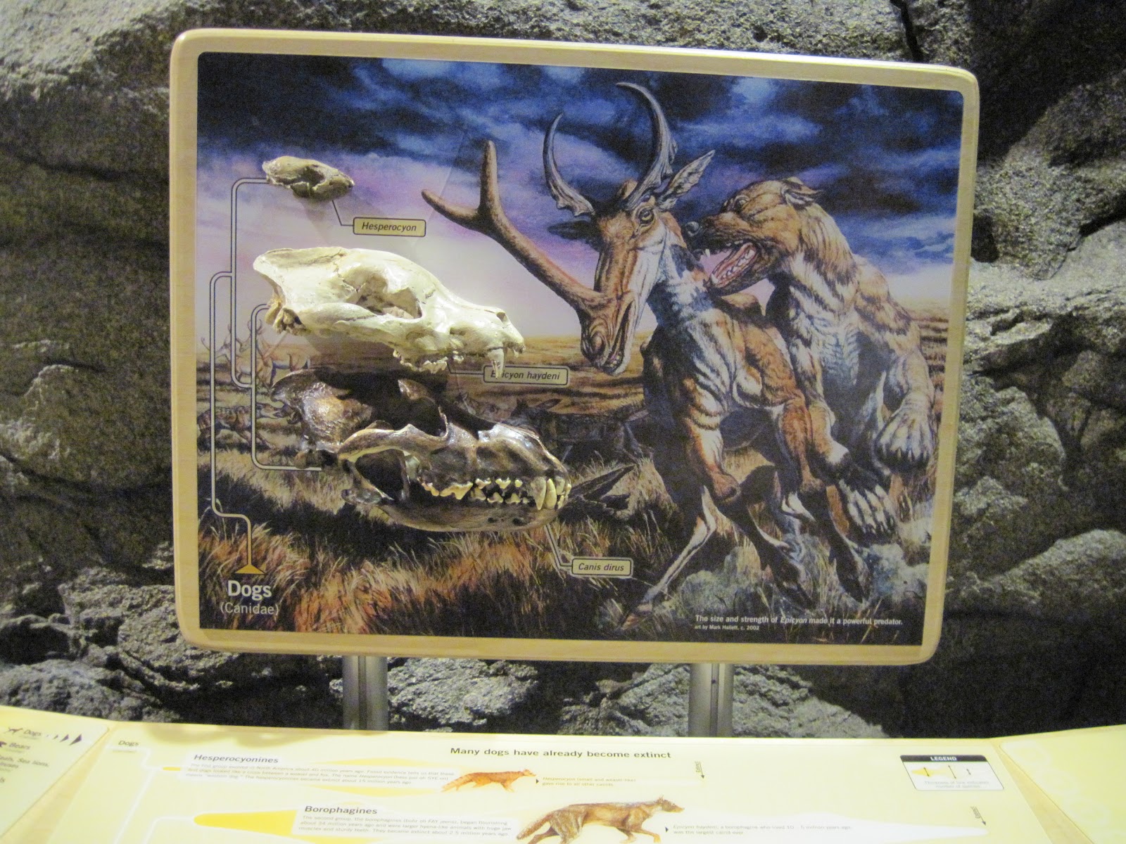 The domestication of dogs from wolves was explained in detail, but there was actually very little on the evolution of canids as a whole. A single station had a few replica skulls of Hesperocyon (an early canid), Canis dirus (the dire wolf), and Borophagus (the bone-crushing dog), and a cladogram showing the relationships of fossil and extant canids. I would have liked to have seen a bit more about the fossil history of dogs, but I guess I’m probably biased.