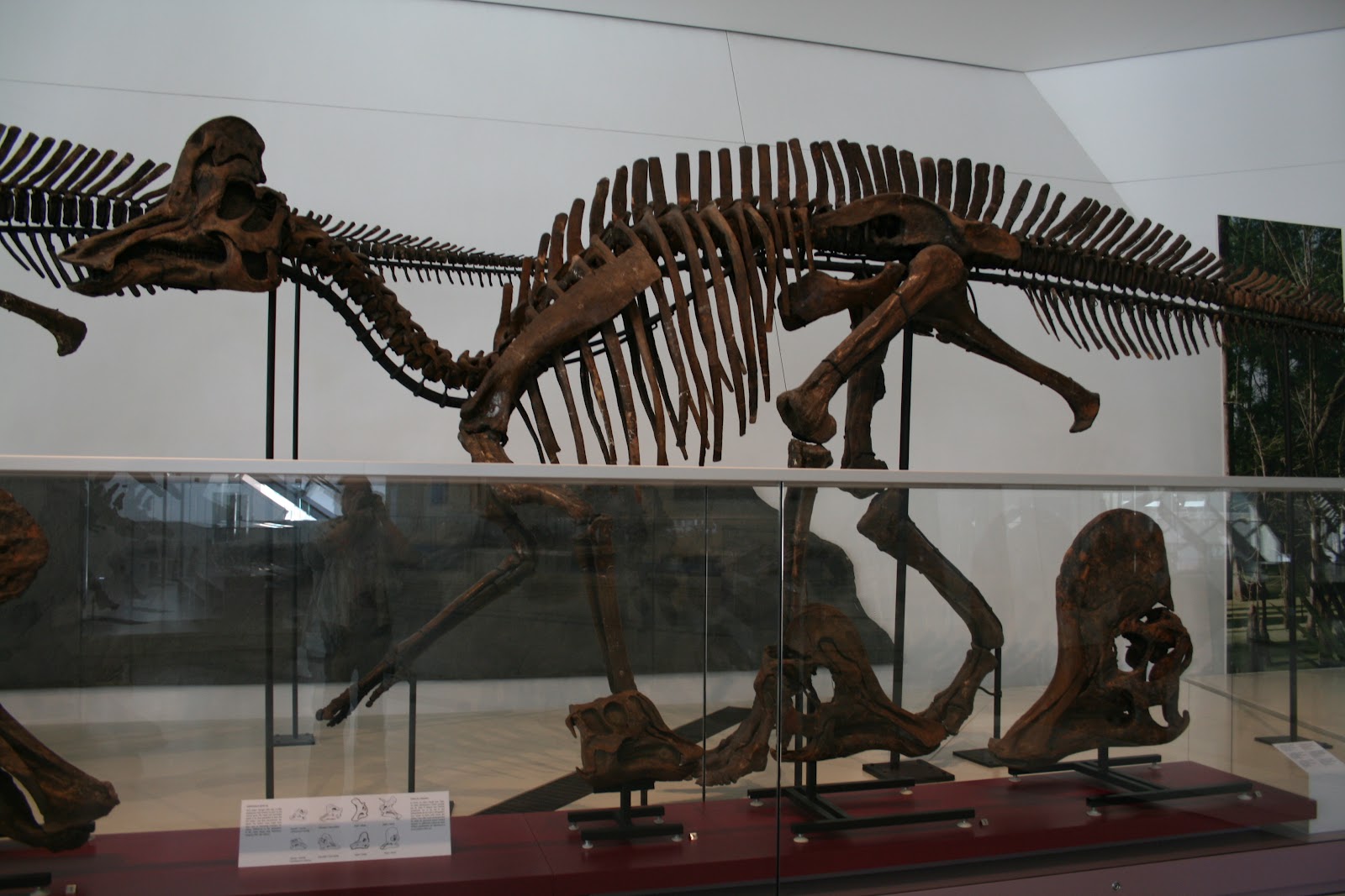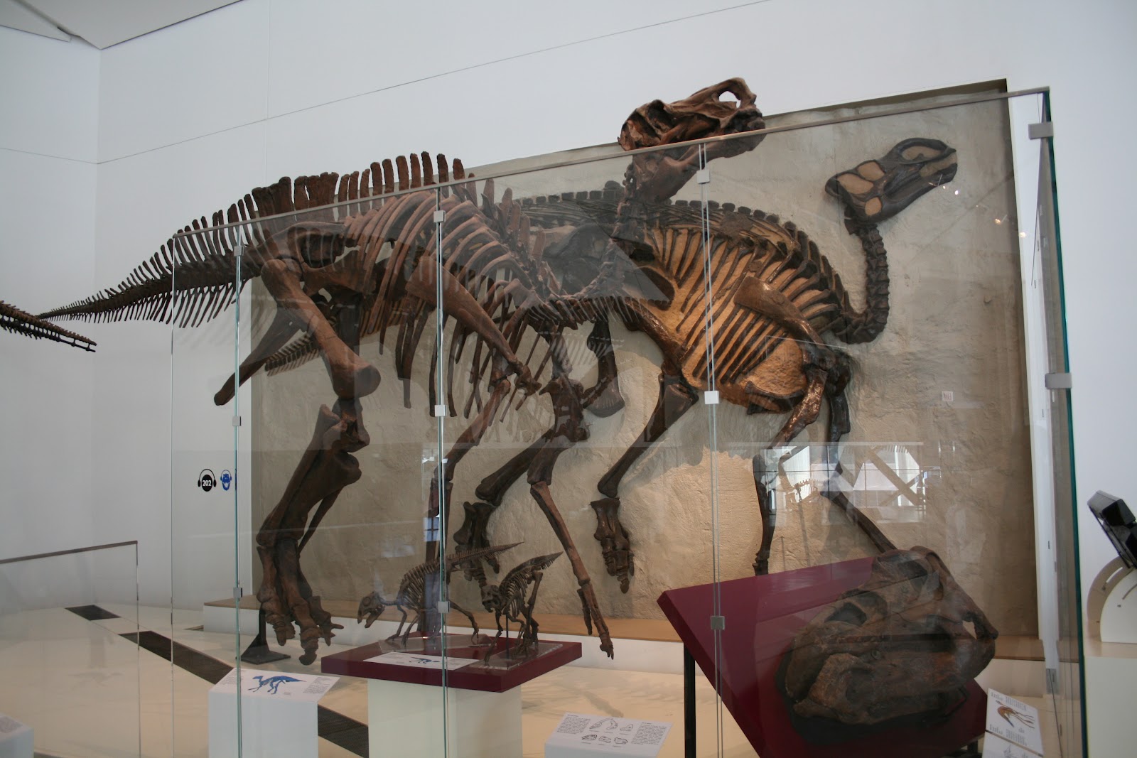 The dinosaur exhibit does not overwhelm with a lot of text, but there is good information about each specimen (what’s cast, what’s real, etc.) provided nearby. In particular, I like the display of ontogenetic changes in the hadrosaurs Corythosaurus (shown here) and Lambeosaurus.