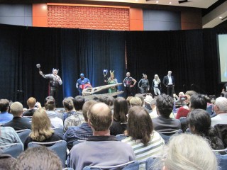 The annual Society of Vertebrate Paleontology meeting wrapped up yesterday. This year we got to visit the very nice city of Raleigh, North Carolina. There were many, many interesting talks and posters which I can’t possibly cover in detail here, but I will look forward to the papers that will hopefully eventually come out of this meeting. SVP is the big-time serious palaeo conference for most of us here in North America…and yet, although at times the talks are SO SERIOUS, what I really like about SVP is how much fun everyone is having. And this brings me to the chairs. The chairs at the Raleigh Convention Centre seem to have built-in whoopie cushions. If you sat down too quickly, the result was unavoidable. (Raleigh Convention Centre: please don’t change this!) And so, during the transition between each talk as people moved in and out of the session, a low murmur of toots resonated throughout the room. This was pretty funny during the talks, but was almost unbearable during the final banquet and awards ceremony on Saturday night. As we recognized the contributions of various members of the SVP, we would rise to give standing ovations. And as about 1000 people sat down simultaneously, the squeaky chairs were that much more noticeable.