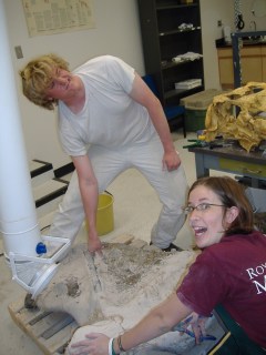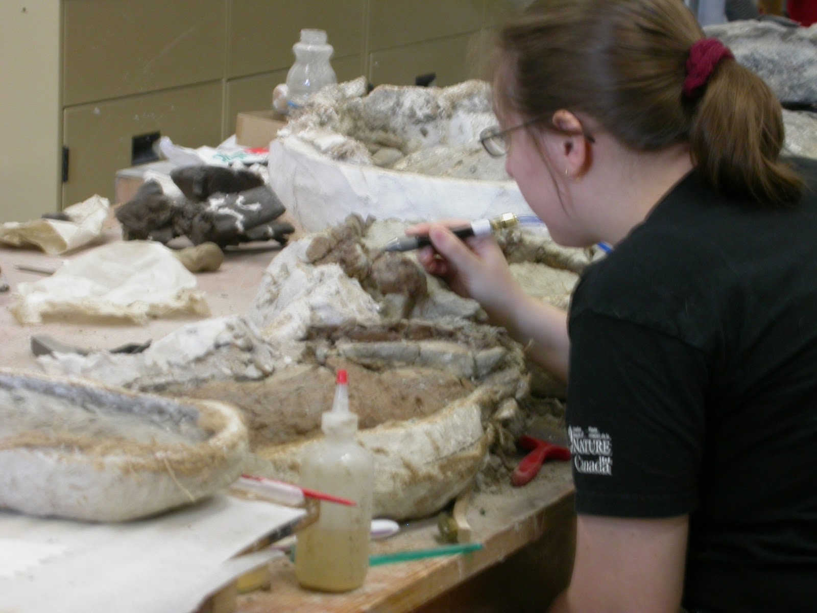 In 2009, I decided to supervise two high school students in the University of Alberta’s WISEST Summer Research Program. WISEST (Women in Scholarship, Engineering, Science and Technology) is an awesome organization that organizes conferences for junior high and high school students, and supports grad students, postdocs, and early career professionals on campus. Their Summer Research Program places high school students into university labs for about 6 weeks during the summer, and by the end the students produce and present a poster discussing what they’ve been up to. In 2009 I was joined by Carmen Chornell and Idel Riemer, who were enthusiastic and excellent fossil preparators! Together we completed preparing the UALVP 31 pelvis, as well as other small bits.