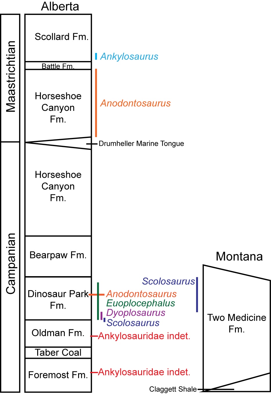 Over the last few posts, I’ve talked about why Euoplocephalus tutus is a valid genus and species, how the Horseshoe Canyon Formation ankylosaurid is really Anodontosaurus lambei, and how the headless and clubless holotype of Scolosaurus cutleri is most likely the same species as the ankylosaurid from the Two Medicine Formation. Here’s a diagram summarizing some of the key points from the paper.