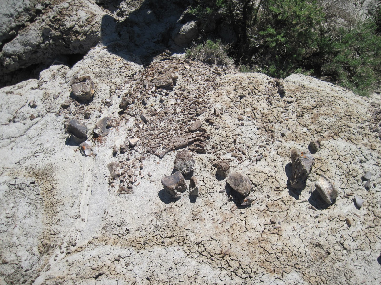 But the rewards of hiking around this terrain are well, well worth it. It is almost impossible to walk around Dinosaur Provincial Park without finding at least some bone. The trick is finding stuff that is worth collecting – the volume of bone is so high that we cannot possibly collect all of it, so we need to be somewhat choosy in what we bring back to the university. (No hadrosaur caudal centra allowed, unless they are pathological!) The bones in this picture are the weathered remains of a hadrosaur. They were too far gone to collect, but we recorded their location with a GPS. We keep a database of uncollected dinosaur skeletons in the park, for understanding relative dinosaur diversity geographically and stratigraphically.