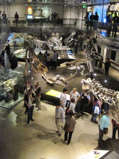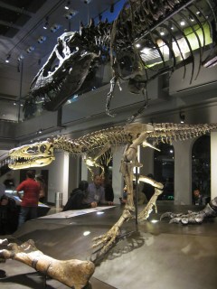 The dinosaurs are split into two galleries, and each has an upper level, allowing for multiple angles of specimen viewing. In this shot you can see Carnotaurus in the foreground, the three tyrannosaurs in the middle, and towards the back are Allosaurus and Stegosaurus.