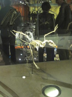 A display case discussing the origin of birds has this Velociraptor skeletal mount…