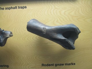 In addition to all of the lovely large skeletal mounts, there’s a very nice wall showcasing some of the smaller fossils, and things like taphonomy and pathology. Here’s a cool example of rodent gnaw marks on a bone!