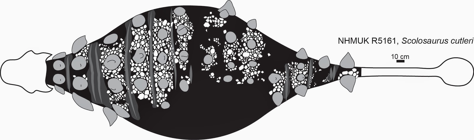The holotype of Scolosaurus cutleri, NHMUK R5161, has the best preserved integument for any North American ankylosaur, and has loads of scale impressions lying overtop of the in situ osteoderms. In Scolosaurus, the scales form rosettes around the osteoderms. The largest scales are generally found closest to the osteoderms, but some large scales are scattered in between the osteoderms as well. Underneath the scales, small ossicles (little osteoderms less than 1 cm in diameter, but usually only 2-4 mm wide) fill the spaces between the larger osteoderms.