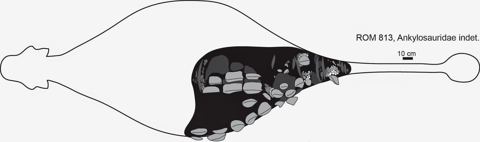 There’s enough overlapping material between these specimens to allow us to compare scale patterns among different ankylosaurs, and the differences support the hypothesis that these are different taxa. Unfortunately, right now we can’t assign ROM 813 to any known ankylosaurid taxon from Alberta – this could represent the postcrania of Euoplocephalus tutus, or Dyoplosaurus acutosquameus, or (less likely) a new taxon of ankylosaurid from the Dinosaur Park Formation. I think it’s safe to say that the differences between Scolosaurus and ROM 813 represent true taxonomic differences, a finding that is in line with previous work by Phil Bell on scalation differences between Saurolophus angustirostris and Saurolophus osborni.