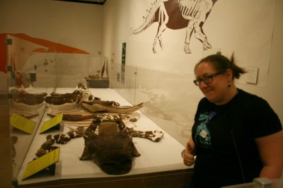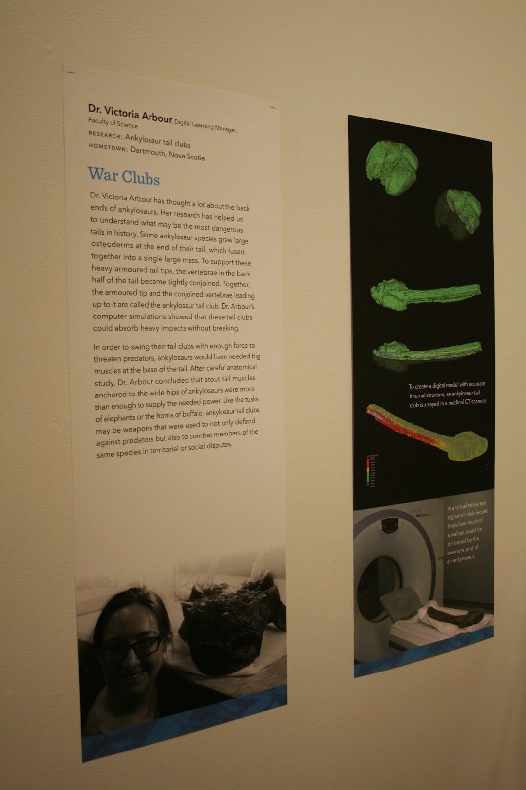 The exhibit focuses in on research projects and new discoveries at the university. You’ll see lots of fossils and casts, but you’ll also see plenty of panels like this one featuring my work on ankylosaur tail clubs. (To see more of the folks in our lab featured in the exhibit, check out the DinoLab’s Facebook album.) I really like this approach, because it shows that science is done by real people, and it shows the specific kinds of questions that we ask in order to tell the bigger stories about dinosaur lives. How DO we find out if ankylosaurs used their tail clubs as weapons? What kinds of techniques do we use? What surprises do we encounter as palaeontologists?