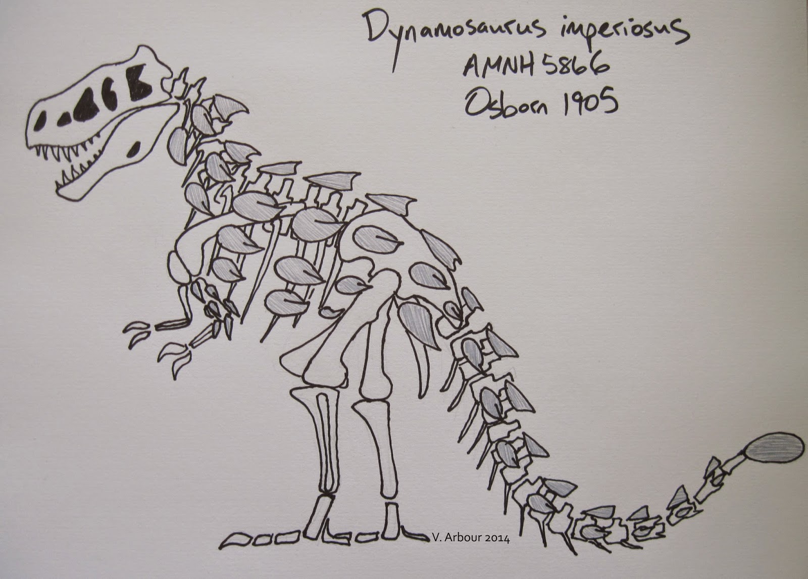 I kid, of course, but I think Dynamosaurus deserves a mention on its more famous relative’s naming day as well. Tyrannosaurus, Dynamosaurus, and Albertosaurus were all named by Osborn in 1905 and although Tyrannosaurus and Albertosaurus have proven to be distinct from each other, Dynamosaurus turned out to be a junior synonym of Tyrannosaurus. If Tyrannosaurus hadn’t appeared first in the publication, good ol’ T. rex might not be the household name it is today and we might all stand and gape at Sue or Scotty or Stan the Dynamosaurus. The distinctive osteoderms are probably Ankylosaurus osteoderms, although I haven’t attempted to track down the specimens myself or any papers that discuss their identity, so I suppose they could also be Maastrichtian nodosaurid osteoderms. Updated 2 October 2015: Last year when I fired this off quickly I completely forgot that the Dynamosaurus osteoderms are figured in Ken Carpenter’s 2004 Ankylosaurus paper!