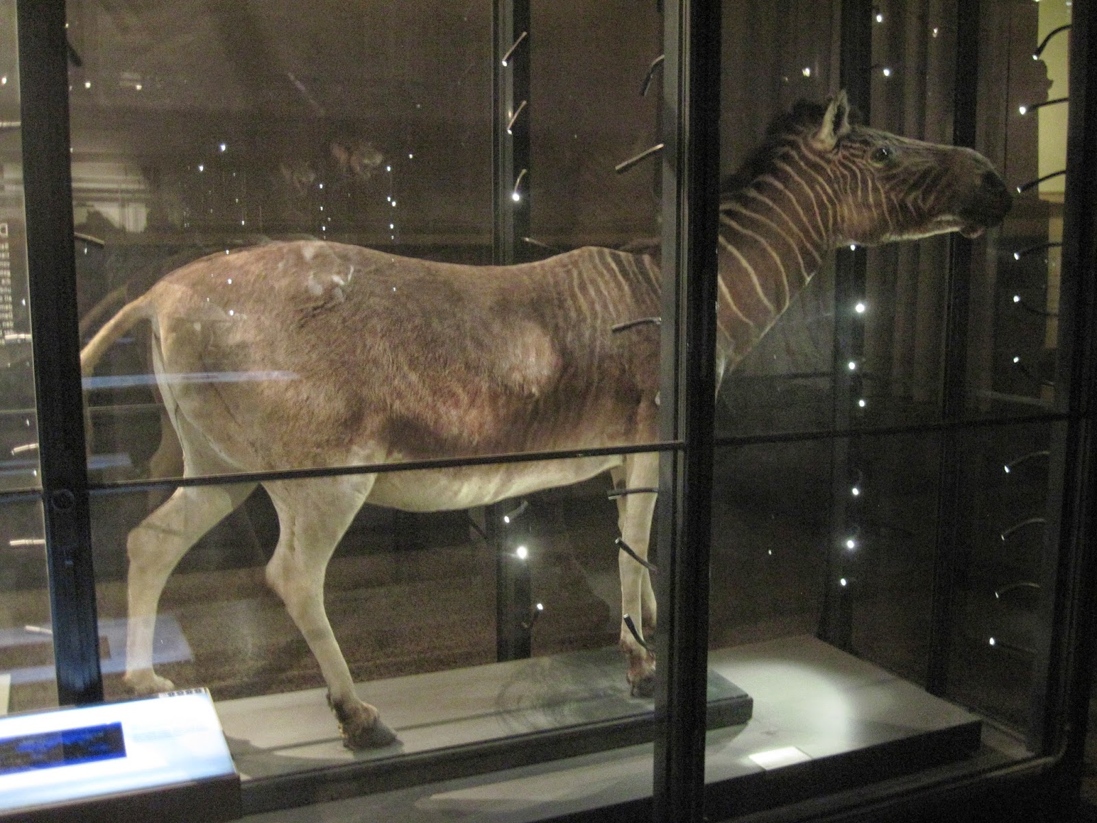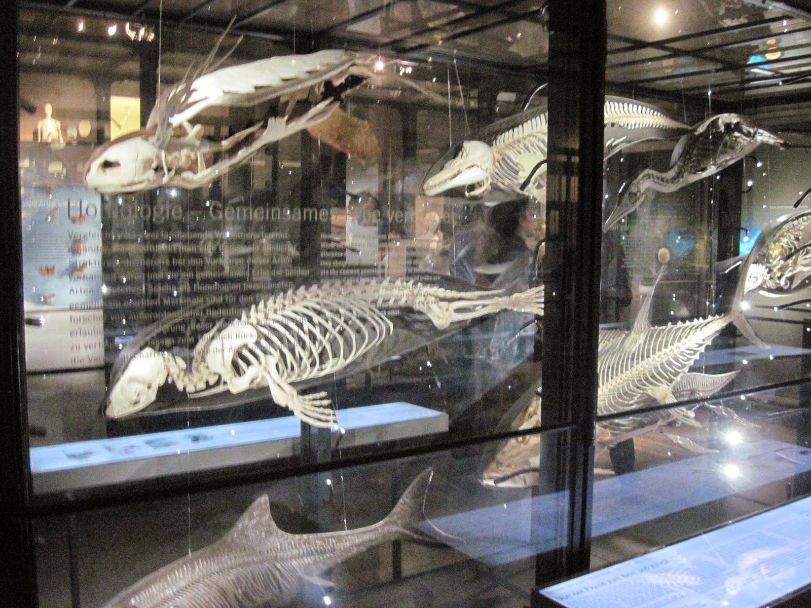 This comparison of aquatically-adapted skeletons was a great way to show homologies and convergences in skeletons. One half of the body was a fleshed-out model, and the other was a skeleton (all were scaled to about the same length). In this photo you can see a sea turtle, seal or sea lion, dolphin, fish, and ichthyosaur, and there was also a penguin, hesperornithid, and plesiosaur in the case as well.