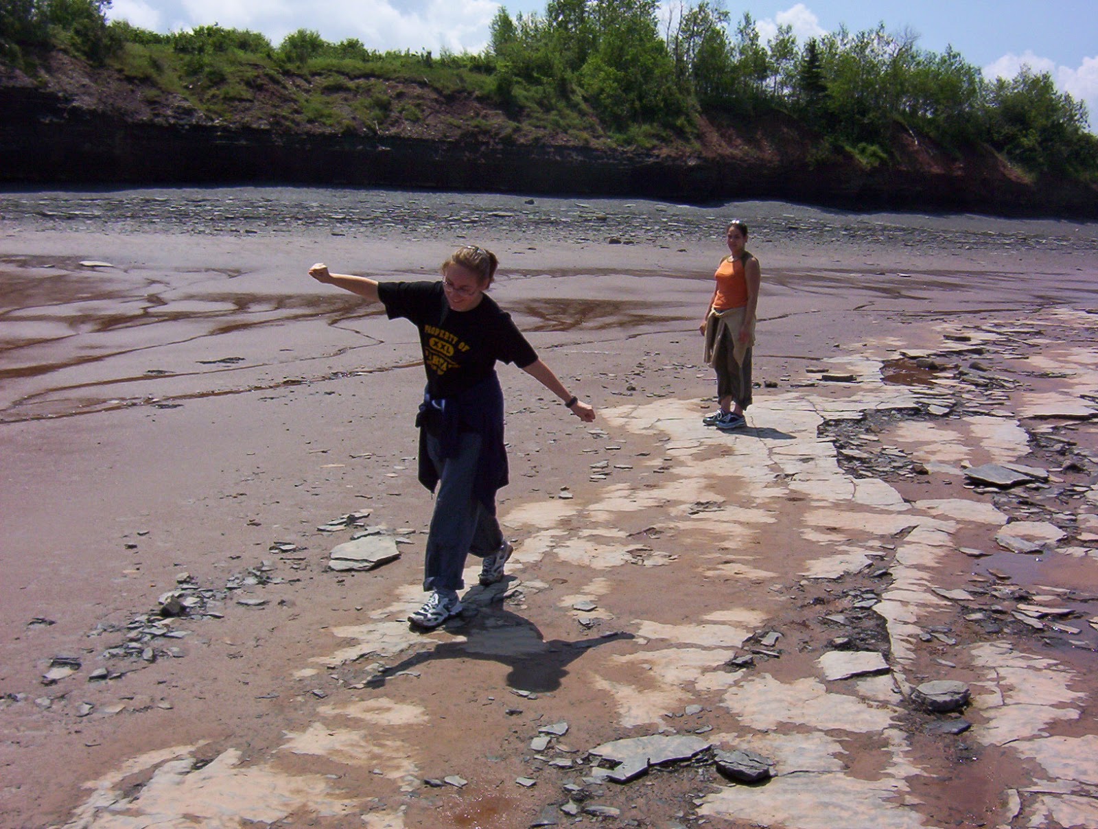 Your friendly neighbourhood ankylosaur palaeontologist, in the before time (i.e. 2003), at Horton Bluff, following in her tetrapod ancestor’s footprints. It’s goopy there.