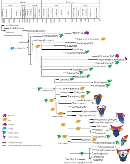 5. And finally, what’s going on with ankylosaurids in the mid-Cretaceous of North America? Why don’t we find any ankylosaurids between Cedarpelta and the later ankylosaurins? Did ‘endemic’ North American ankylosaurids go extinct during that time? And why does Aletopelta have such a weird basal phylogenetic position despite being from the Campanian? I don’t really have answers for some of these questions, although if you come to the Society of Vertebrate Paleontology meeting in Dallas this October I’m going to try addressing some of them. For now, Aletopelta remains the biggest ankylosaurid enigma to me – it really shares very few things in common with the other Campanian ankylosaurids and I doubt it is an ankylosaurin from the Asian immigration into North America – could it represent a distinctive lineage of North American ankylosaurids stemming from things like Gastonia or Cedarpelta, for which we just don’t have other representatives at the moment? Or, is it a nodosaurid masquerading as an ankylosaurid because I haven’t sampled the right taxa or characters?
