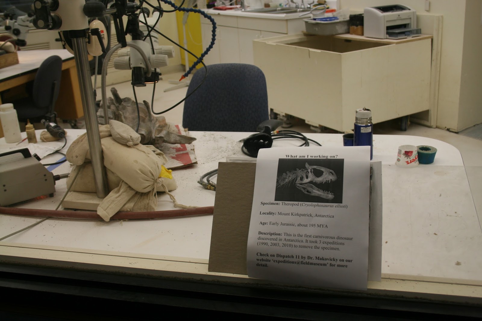 Bonus photo! In the fishbowl prep lab, they are working on Cryolophosaurus bones collected during the last expedition in 2011!