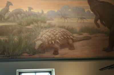 PALAEOSCINCUS SPOTTED. One thing that I really love is that a bunch of old Charles Knight paintings are still displayed with pride throughout the exhibit, with interpretive signage putting them into context for what we’ve learned since they were painted. Here we can see a classic ‘Palaeoscincus‘, an old interpretation of what Late Cretaceous ankylosaurs looked like back when we didn’t have as much information about nodosaurids vs. ankylosaurids. This fellow has the long, relatively unornamented snout and large shoulder spines of Edmontonia (a nodosaurid), and the tail club of Ankylosaurus (an ankylosaurid).