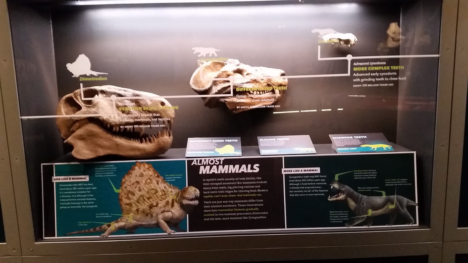 The exhibit includes a nice diagram showing the changes that occurred between the earliest synapsids, like Dimetrodon, to modern mammals, and even talks about the concept of ‘crown groups’.