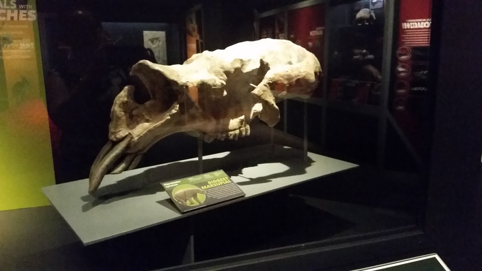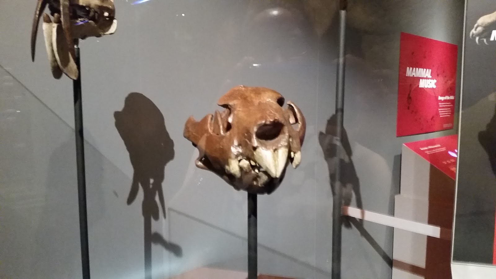 Lots of exhibits showcased particular features of mammal anatomy and showed convergences across clades. Here’s Thylacoleo, the marsupial lion, with Thylacosmilus, the marsupial sabre-tooth in the background.