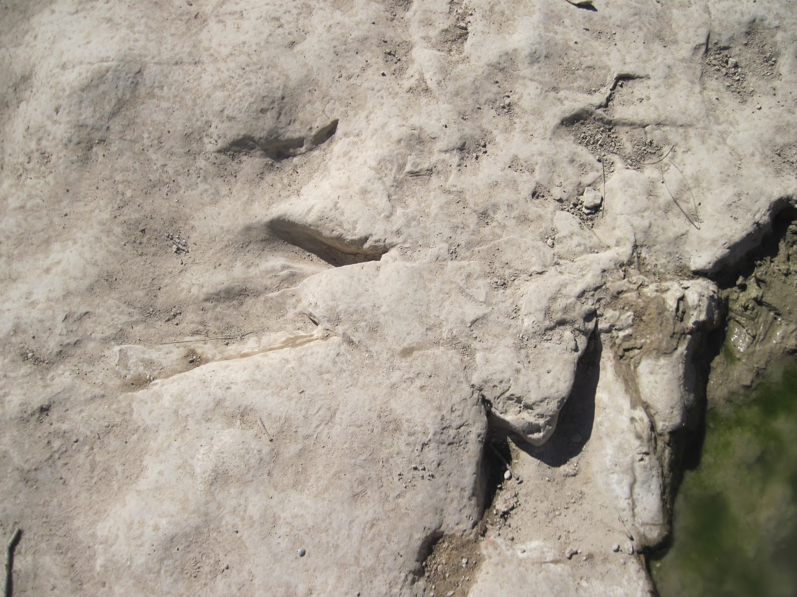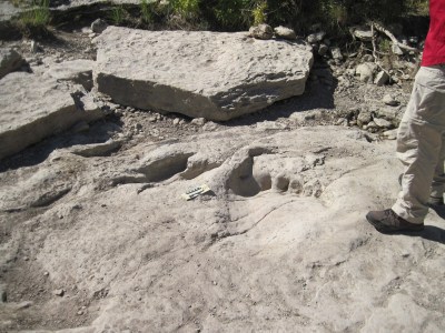 And here’s the other trackmaker, a large sauropod, possibly something like Sauroposeidon. In case that one is hard to make out, the hind foot print is about a foot to the left of that person’s shoe, and is the large smooth depression with a series of vertical shadows at the front – those are the claw marks from a sauropod’s hind foot. The front feet made totally different tracks, which look kind of like crescents or half-moons.