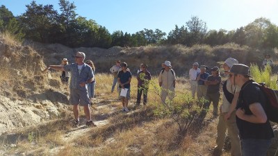 While the morning was still cool, we ventured out to the Jones Ranch quarry, where the remains of several Sauroposeidon were excavated. Originally called Paluxysaurus, these bones belonged to several large sauropods from the Twin Mountains Formation, which is about 113 million years old or so. I was pretty impressed by the size of the quarry – I’m standing maybe 5 feet in front of one of the quarry walls, and looking towards the other.