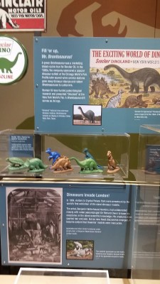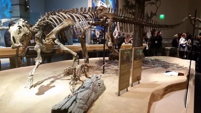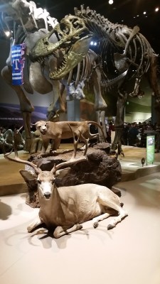 Another interesting thing the museum has done is to place modern animals alongside the dinosaurs for comparative purposes. Here we’ve got predators and prey – a mountain lion and a deer, and Tyrannosaurus and the sauropod Alamosaurus (off to the left of my photo).
