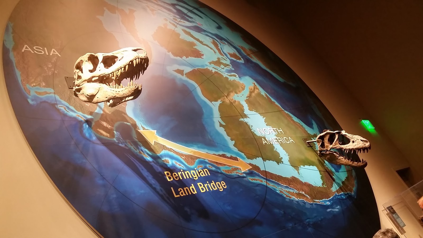 My favourite exhibit in the whole museum! One of the only places where I’ve seen the North American-Asian faunal interchange visualized in an exhibit. Tarbosaurus is in Asia, and its close relatives are in North America (I can’t remember exactly which taxon is featured here, but perhaps it is Bistahieversor based on its geographic position?). Also whoa, Beringia sure looks strange from this polar vantage point.